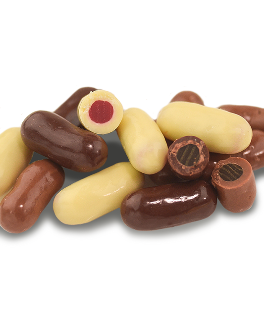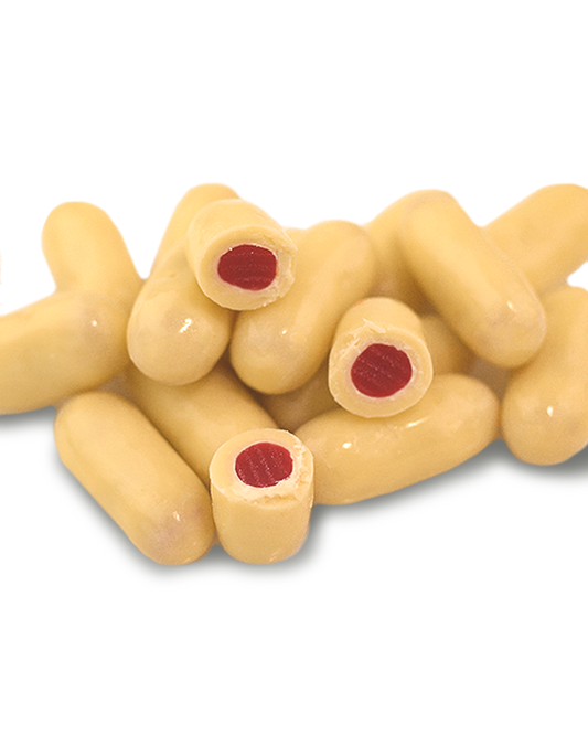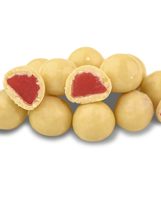 White Premium Couverture Chocolate Raspberry Licorice Bullets 250g