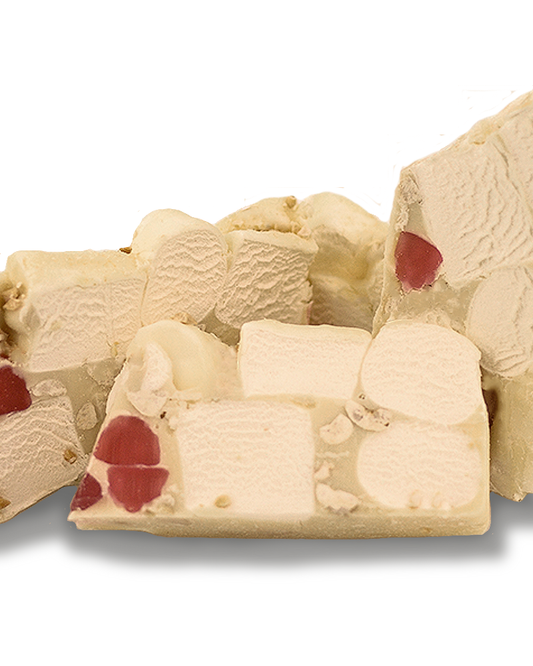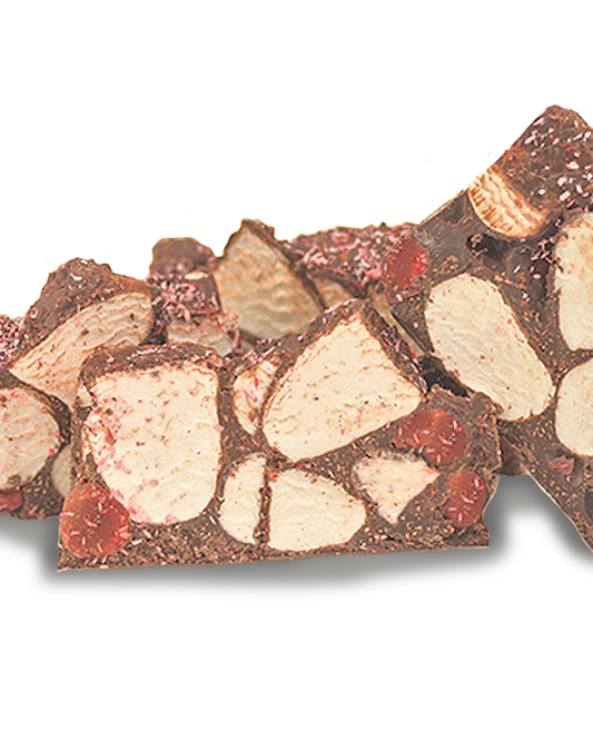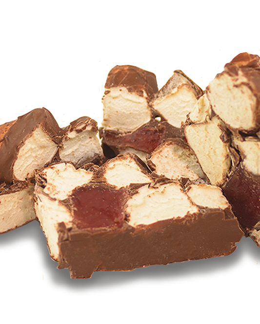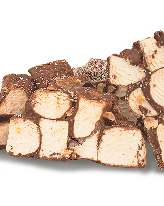 Just Sweets handmade signature rocky road. Using our secret recipe of 20 years, our delectable range includes, fluffy vanilla marshmallows mixed with the flavour of choice, enrobed in delicious chocolate.
