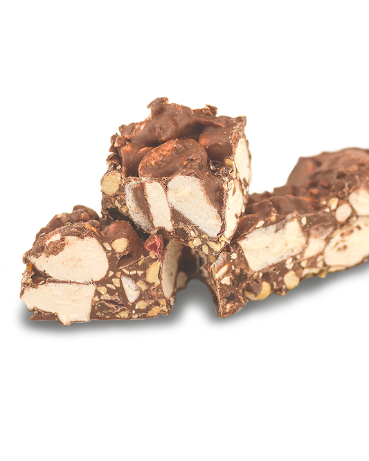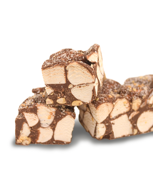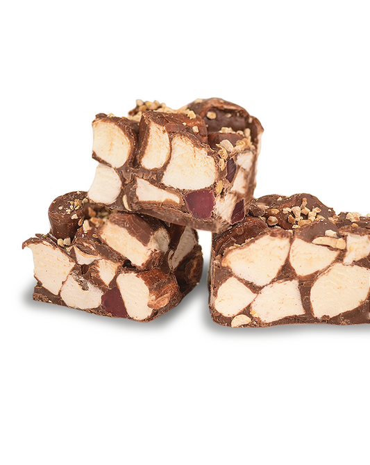 Just Sweets handmade signature rocky road. Using our secret recipe of 20 years, our delectable range includes, fluffy vanilla marshmallows mixed with the flavour of choice, enrobed in delicious chocolate.